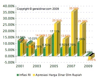 Apalagi, gaji para pegawai dinilai dalam Rupiah atau sehelai kertas yang tentu daya belinya tegerus dari waktu ke waktu akibat inflasi. Dalam gambar di atas kita bisa lihat tingkat inflasi di negeri ini periode 2001 hingga 2009 (kecuali tahun 2009 adalah data inflasi hanya di bulan juli saja yaitu sebesar 0,66%) disandingkan dengan kenaikan (apresiasi) harga dinar dalam Rupiah dalam kurun waktu yang sama. Secara rata-rata antara tahun 2001-2008 tingkat inflasi per tahun adalah 8,98%. Nah, agar tidak tergerus inflasi maka gaji pegawai atau penghasilan seseorang mestilah naik di atas tingkat inflasi agar tetap dapat mempertahankan daya belinya. Maka menjadi tugas pemerintah untuk menekan inflasi atau meningkatkan pendapatan rakyatnya agar tetap berada di atas tingkat inflasi, keduanya memang tidak mudah.